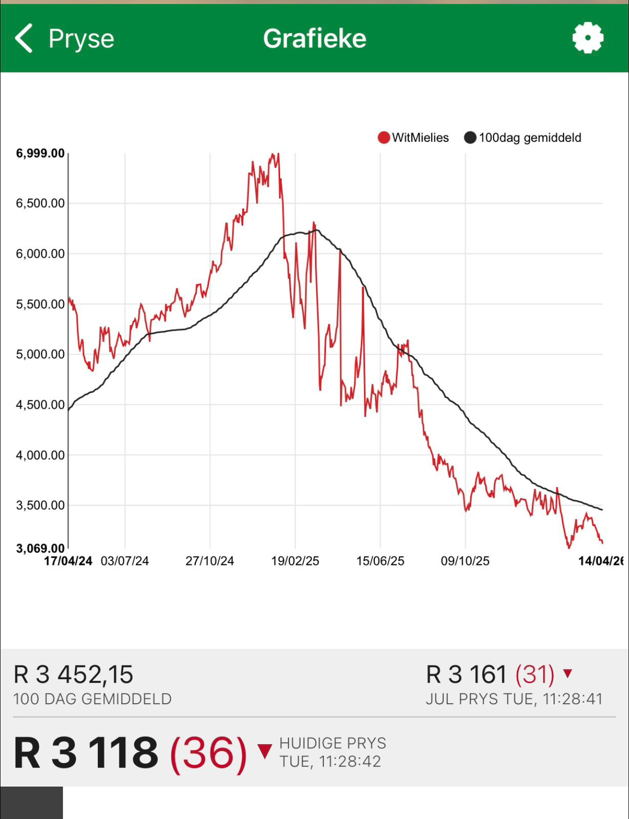 It shows that white maize spot prices in the country are down 39% from a year ago, trading around R3,118 per tonne.